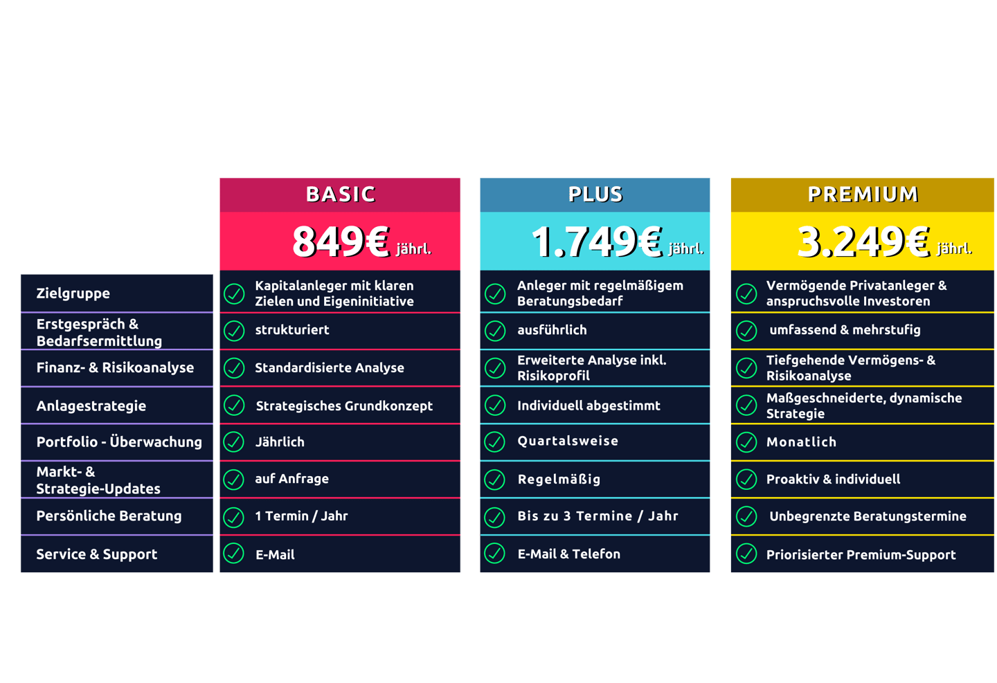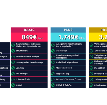 Wählen Sie das Leistungsniveau, das zu Ihrer aktuellen Lebenssituation passt – und profitieren Sie von professioneller Analyse, durchdachten Anlagestrategien und persönlicher Betreuung.